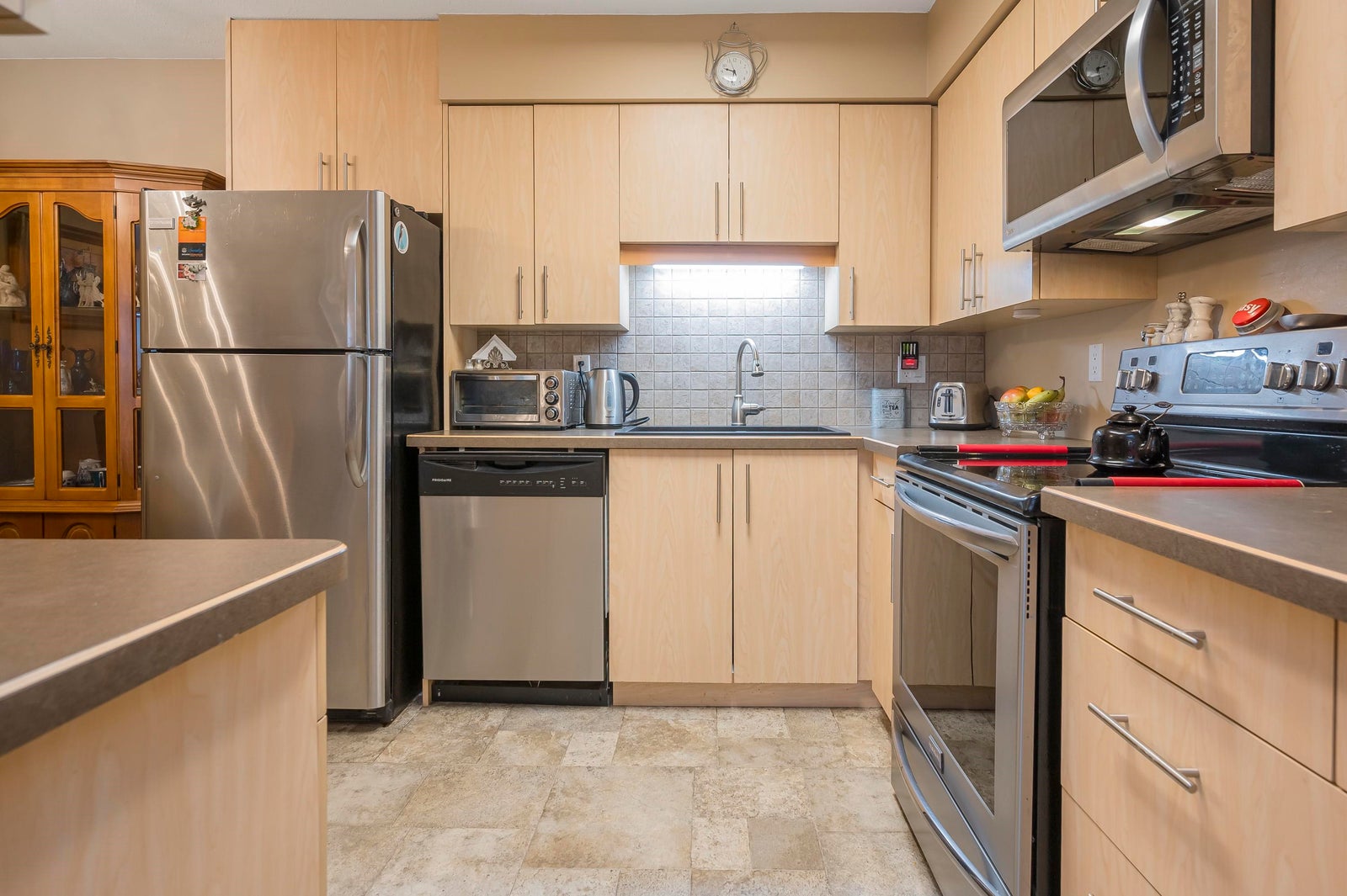 Open House CANCELLED. Welcome to Evergreen Village. This 55+ complex is always popular due to its well run strata & abundance of amenities including indoor pool, hot tub, workshop, exercise room, guest suite & a vibrant community. This 1 bed / 1 bath, 784 sq ft unit has been well maintained & is bright & roomy with the balcony providing extra outdoor living space. The kitchen features S/S appliances, nice updated cabinetry, ample counter space and an dining area making it ideal for all your cooking needs. There is in-suite laundry with a sink & extra storage adding to the convenience of living here. The complex is ideally located near transit, shopping and all other amenities. Great price. Come take a look.